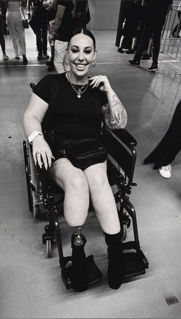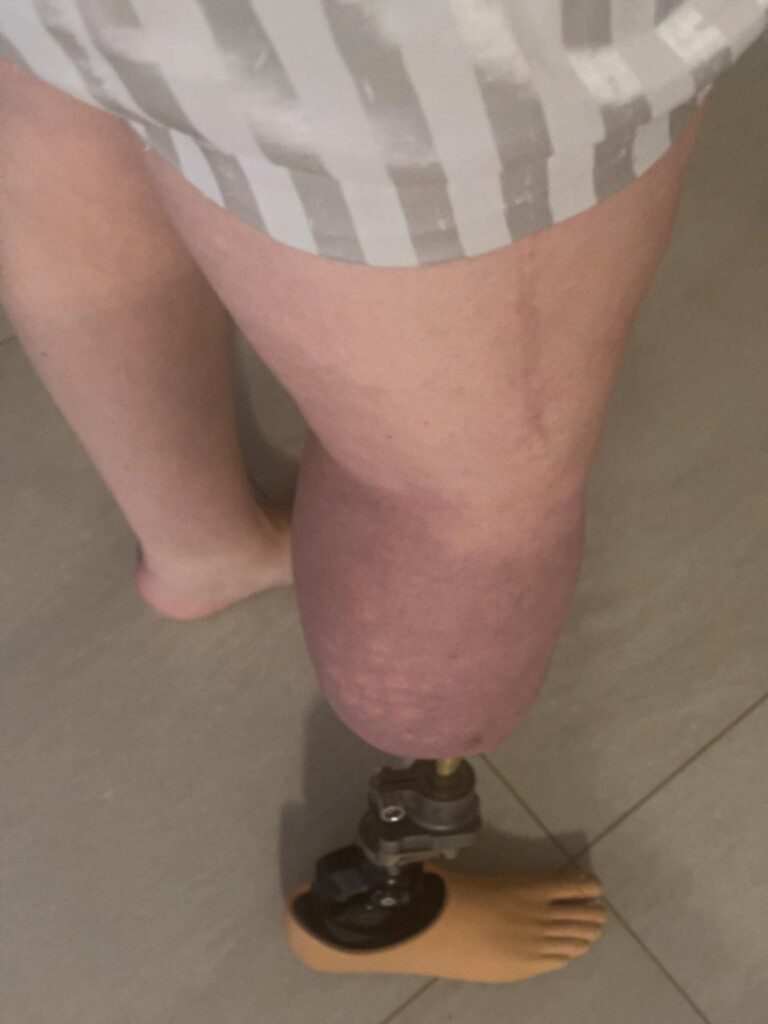 One year down the track a nerve study showed that the sural and tibial nerves had been killed from the crush injury to the sciatic nerve. Her lower leg would never recover. Jess wanted an amputation with the hope to walk once again. We went to see a world renowned surgeon who performed osseointegration here in Australia as Jess could not have anything touching her leg due to hypersensitivity, so a normal prosthetic over her stump was not an option. The surgeon made it quite clear that the amputation would not take away her CRPS pain, but it would give her the ability to walk again as her leg was necrotic (dying). Jess had a below knee amputation at 25 years old with osseointegration. She can walk only short distances, but that beats being confined to a wheelchair.